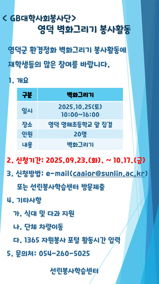 (선린GB대학사회봉사단)영덕 벽화그리기 봉사자 모집_신청일 연장