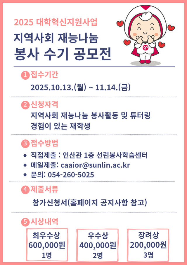 2025학년도 지역사회 재능나눔 봉사활동 수기공모전을 아래와 같이 진행하오니 대상자들의 많은 참여 바랍니다.